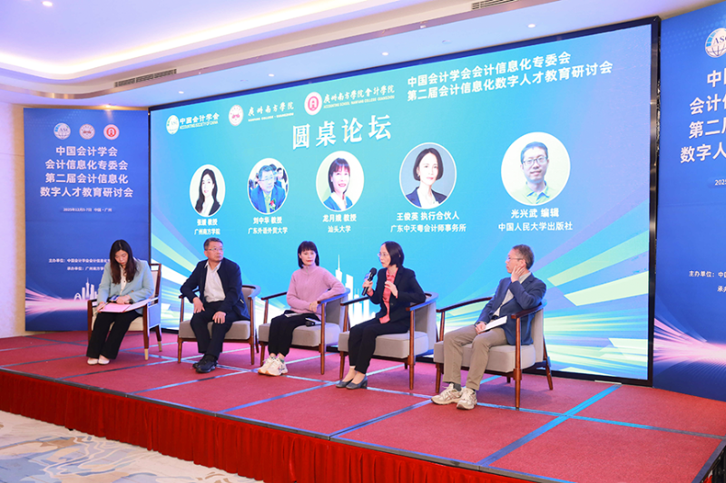 随后举行的圆桌论坛由广州南方学院张媛教授主持,广东外语外贸大学刘中华教授、汕头大学龙月娥教授、广东中天粤会计师事务所执行合伙人王俊英、中国人民大学出版社编辑光兴武等嘉宾围绕“数智化时代人才培养与教材建设”展开对话。嘉宾们结合高校教育实践、行业人才需求、从教材内容建设、培养路径创新、校企协同机制等角度探讨如何通过校企协同开发、多模态教学资源整合等方式,共同推动会计教材内容与教学模式的创新突破。